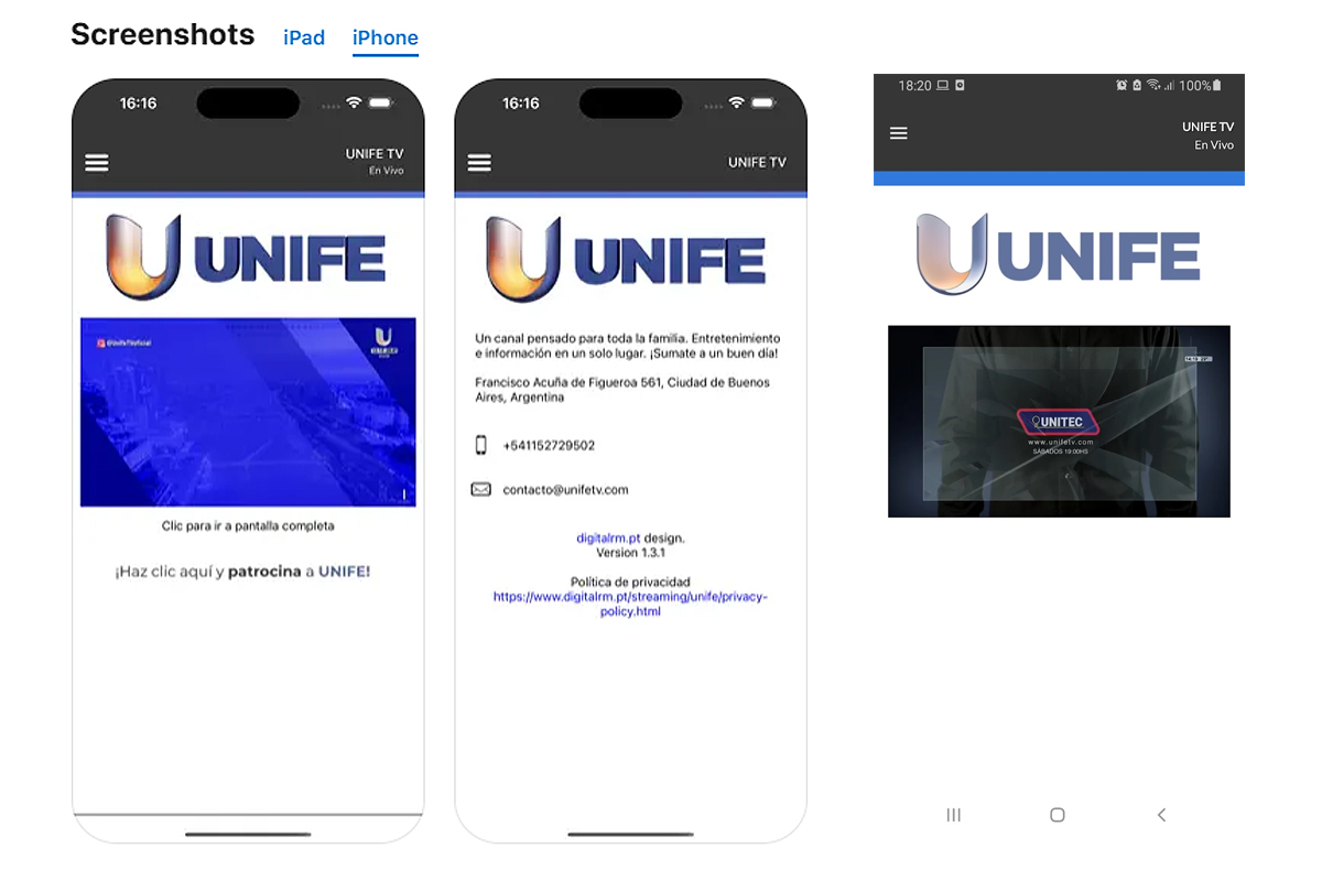 Versión iOS (iPhone y iPad): https://apps.apple.com/ar/app/unife-tv/id1517597062